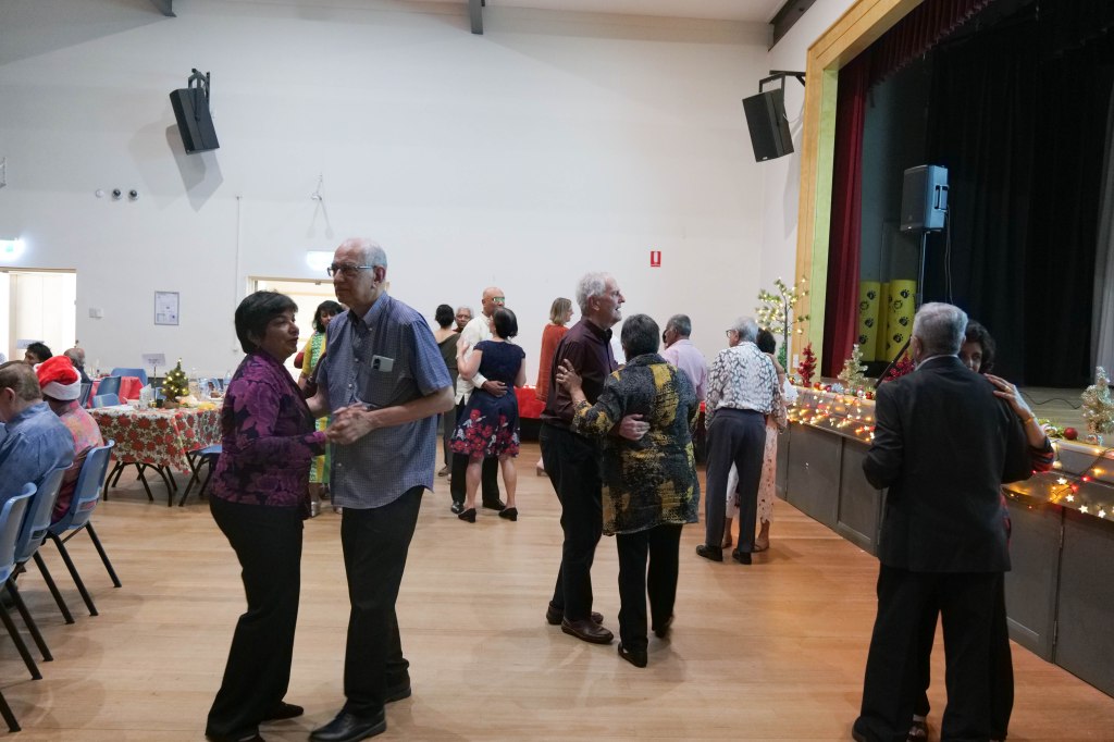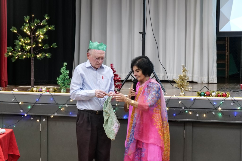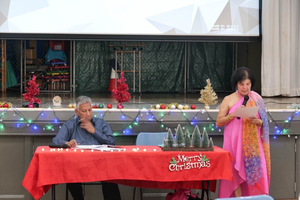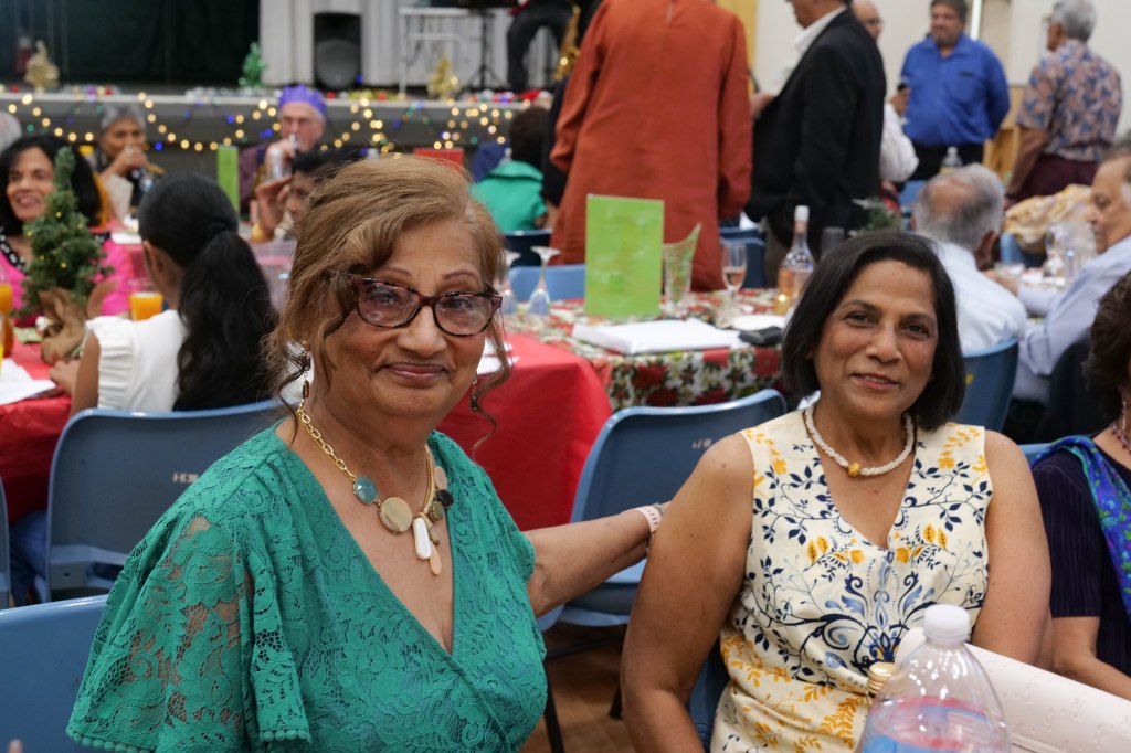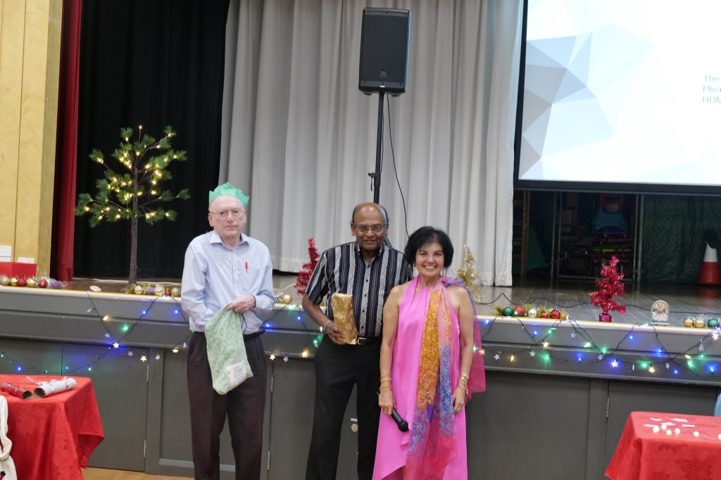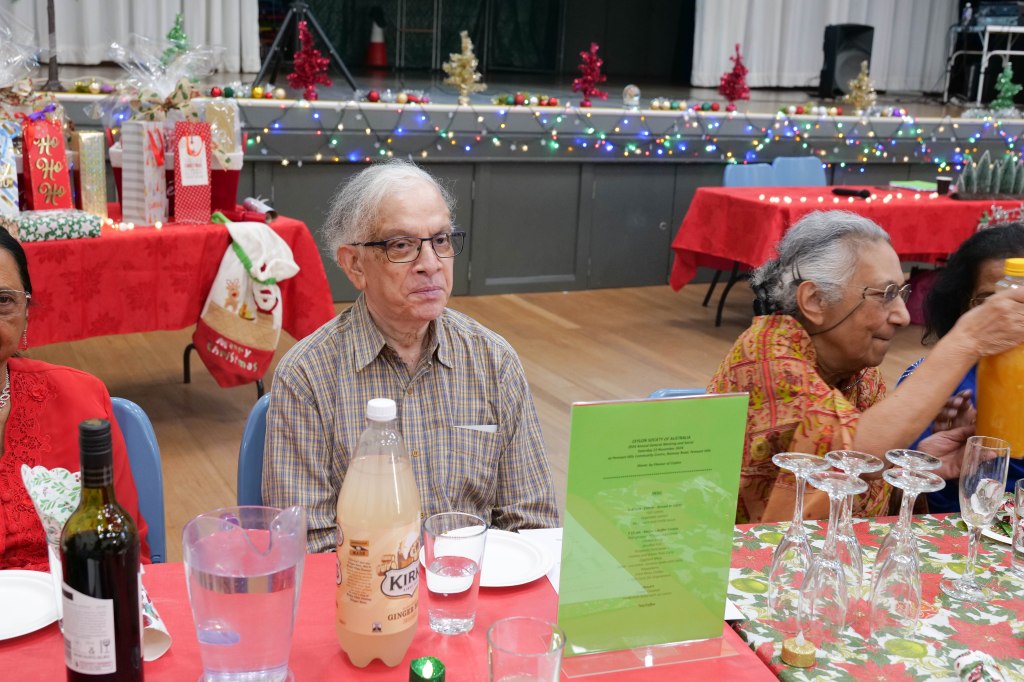 Food Glorious Food – Everyone tucking inThiru Arumugam reading answers to the Trivia Quiz Thiru Arumugam with winner of Trivia Prize Indrajith ImbulanaCSA Choir accompanied by Shirani RodrigoEveryone joining in for the singalongThiru Arumugam and Pauline Gunewardene drawing the Raffle