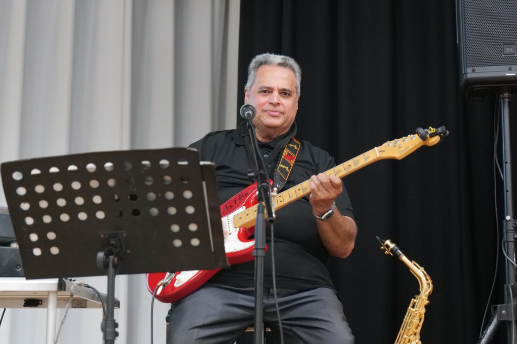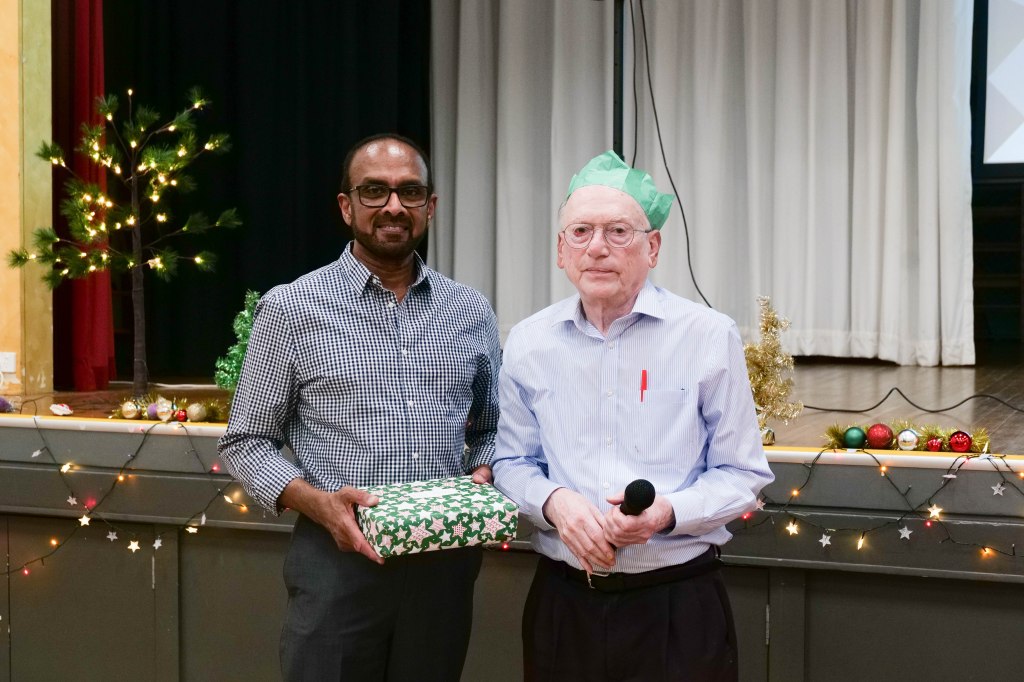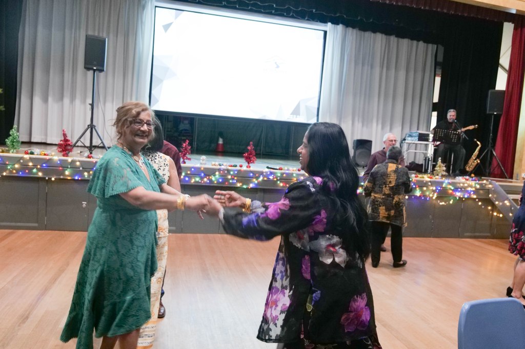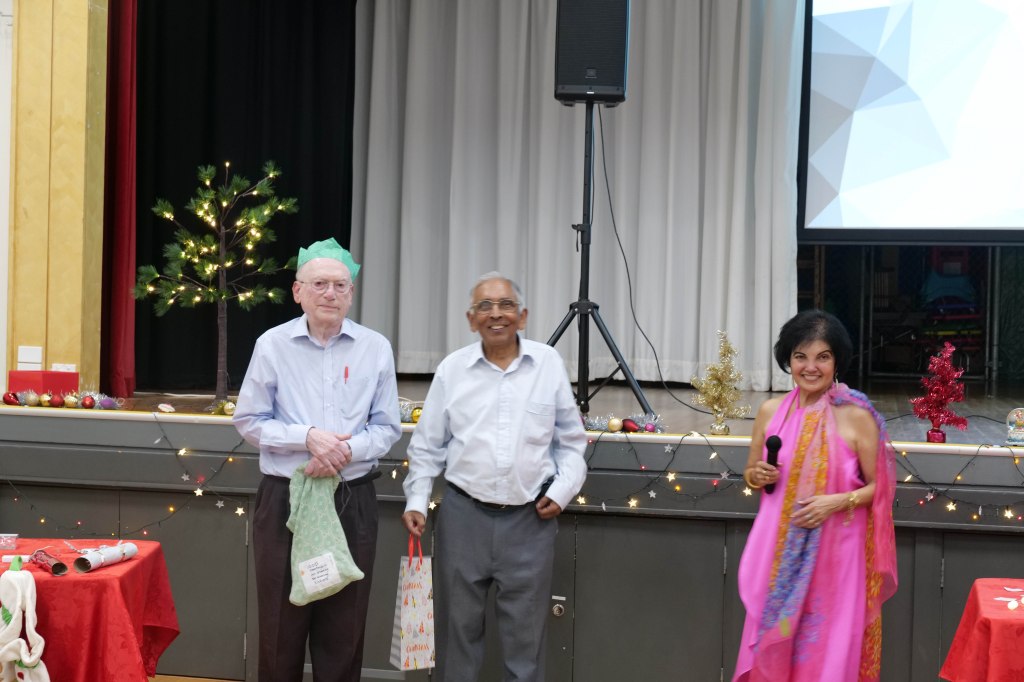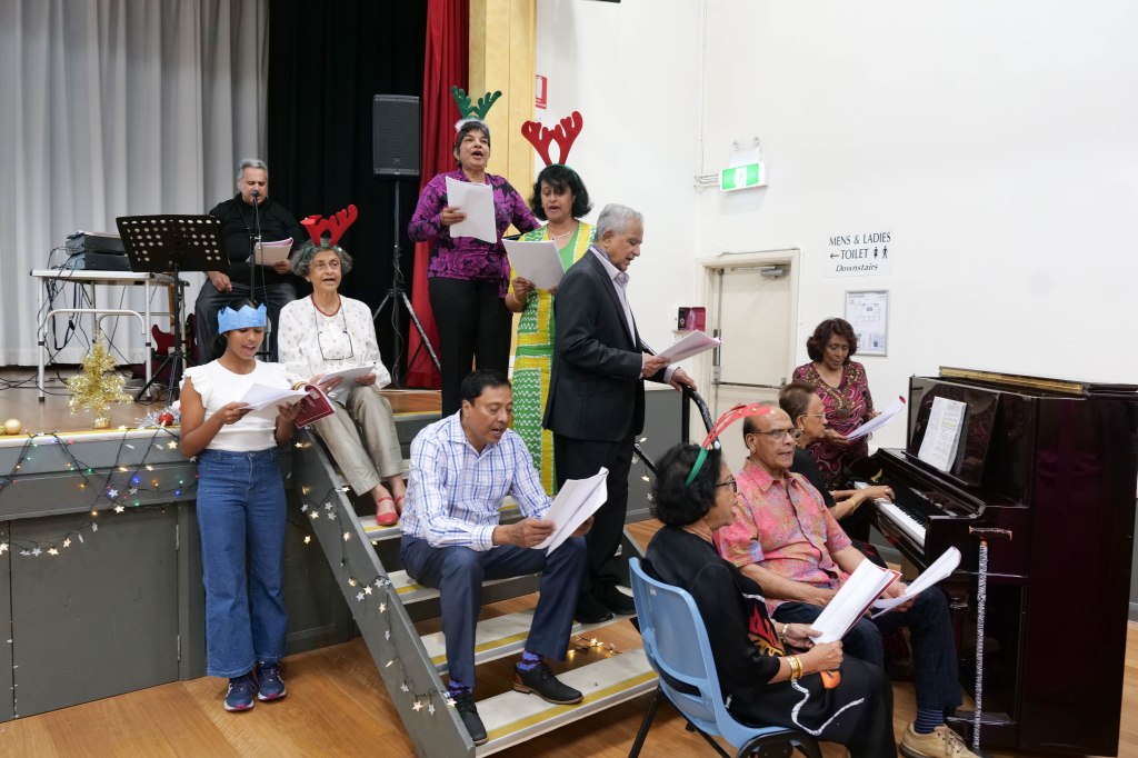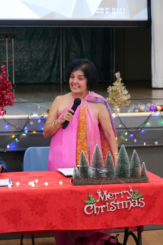 Food Glorious Food – Everyone tucking inThiru Arumugam reading answers to the Trivia Quiz Thiru Arumugam with winner of Trivia Prize Indrajith ImbulanaCSA Choir accompanied by Shirani RodrigoEveryone joining in for the singalongThiru Arumugam and Pauline Gunewardene drawing the Raffle